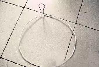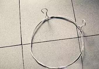 2、如圖,用鉗子將兩個衣架分別彎成一個圓形的架,再將衣架的掛鉤朝外扭一下,使其與圓面成直角。