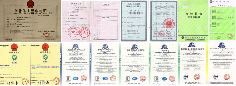 欣方圳營業執照、稅務登記證、組織機構代碼證,垃圾桶檢驗報告資質,“欣方圳”注冊商標,信息安全管理、知識產權管理、ISO9001:2015、ISO14001:2015、OHSAS18001認證企業