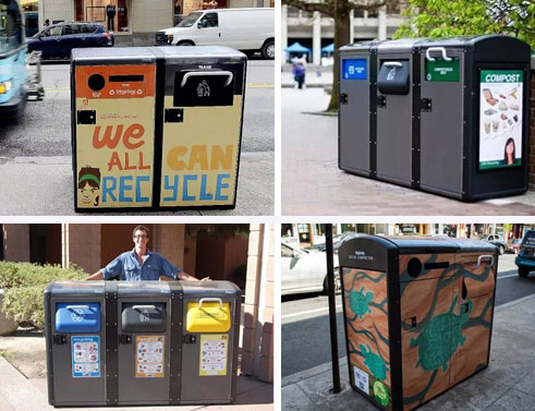還有各種涂裝各種顏色,鋪主腦洞一開,要是在這垃圾桶上裝個顯示屏,是不是就變成了可視窗口?人流量那么大,賣廣告的話肯定也是無比的掙錢。