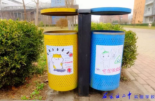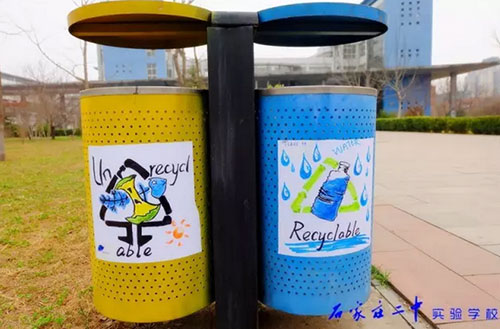 2016年3月18日,石家莊二中實(shí)驗(yàn)學(xué)校2015級高一11班全體66名同學(xué)利用班級值周的時(shí)間,手繪百幅垃圾分類標(biāo)志,為校園垃圾桶換上了“新裝”。18日上午,高一11班教室內(nèi),66位同學(xué)拿起五顏六色的水彩筆,在紙張上設(shè)計(jì)出各種各樣的“垃圾分類”標(biāo)識和警示語,內(nèi)容涵蓋了分類標(biāo)志、垃圾擬人、科普漫畫等,圖面生動有趣。次日下午,同學(xué)們又從教室奔向校園每個(gè)角落,將精心繪制的圖案張貼在校內(nèi)所有的垃圾桶上,提醒過往師生將垃圾分類,維護(hù)我們共同的家園。