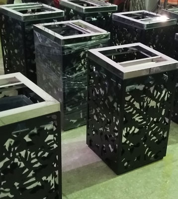 鋼制環衛垃圾桶外筒采用優質冷軋鋼激光切割圖案,四面花紋圖案一樣,酸洗磷化表面噴塑黑色啞光。內膽采用加厚鍍鋅板制作,整體美觀防銹耐用。