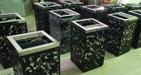 • 產品材質:創意定制戶外鋼制鏤空環衛垃圾桶采用優質冷軋鋼經除油-除銹-表調-磷化處理后,表面采用汽車靜電粉末噴漆工藝,噴塑粉主要有丙烯酸粉末、聚酯粉末等。雙層防銹,漆面色澤耐久;