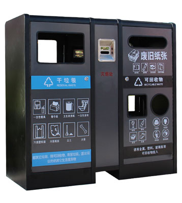 采用金屬材質表面烤漆工藝防銹處理,可回收物和其他垃圾2大分類設計,細分廢舊紙張、塑料、玻璃瓶可回收物多分類收集,投口膠條封邊防毛刺利口傷手。