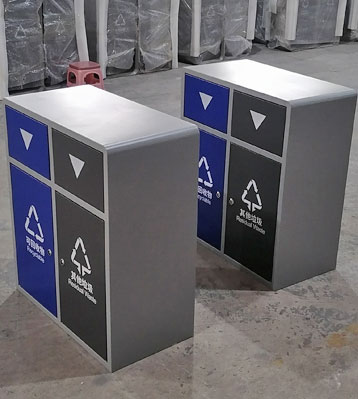 方形外觀兩分類垃圾投放口,欣方圳采用激光切割焊接成型,邊角精細打磨拋光,配鍍鋅內桶防銹耐腐蝕,桶身分類標識醒目,戶外塑粉表面烤漆工藝戶外防銹不褪色耐用。